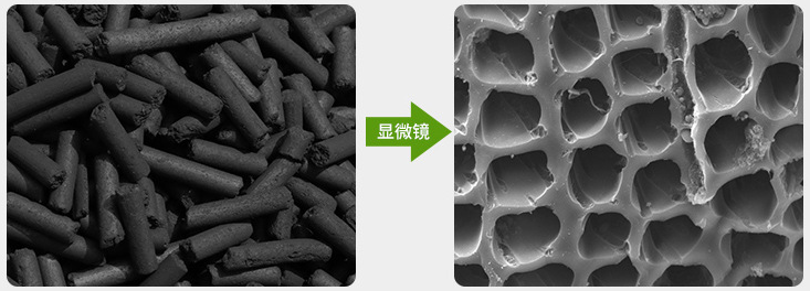 显微镜下的活性炭内部孔隙细密均匀,通过自身的范德华吸力将有害气体物质牢牢的锁住。